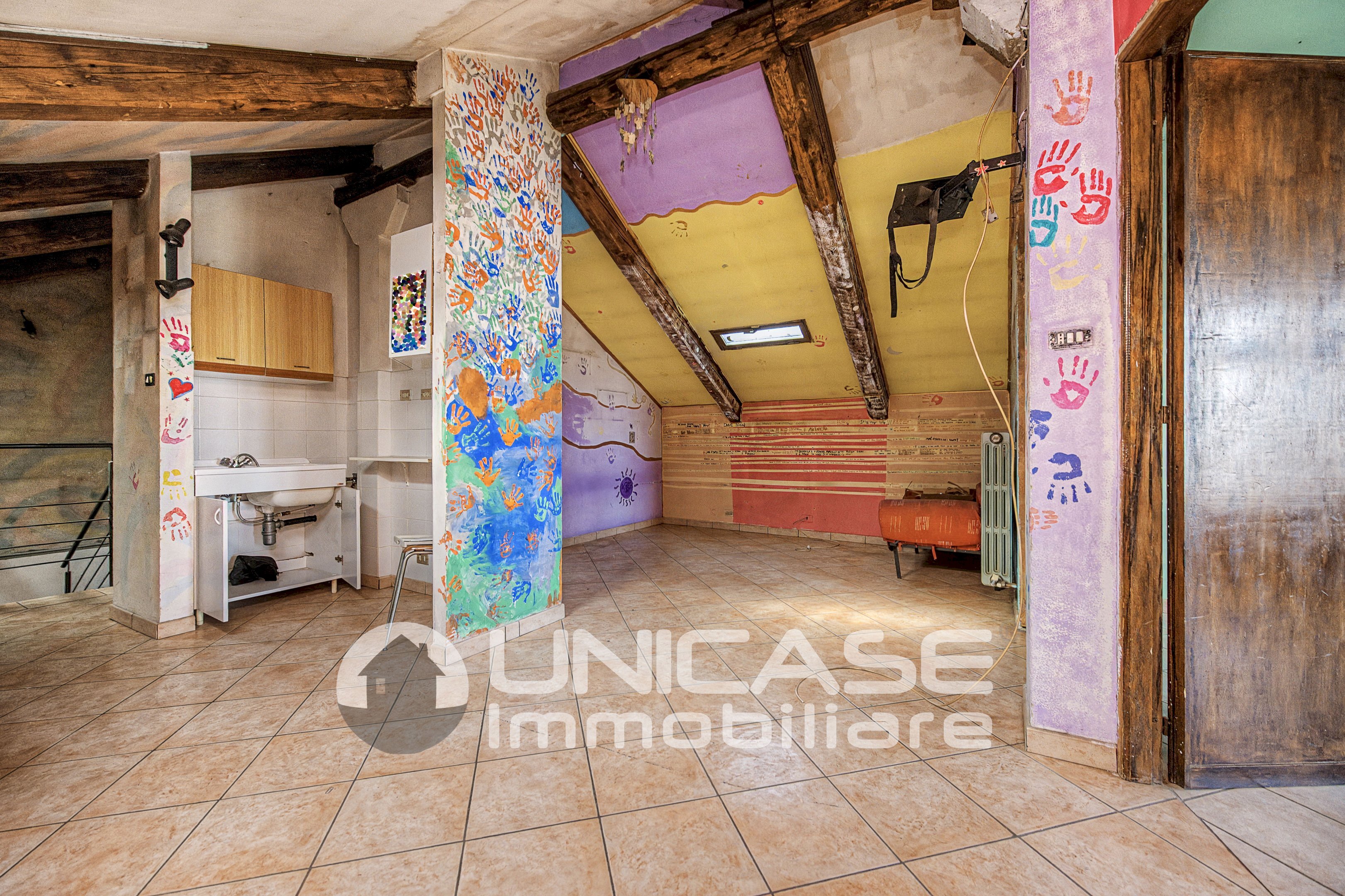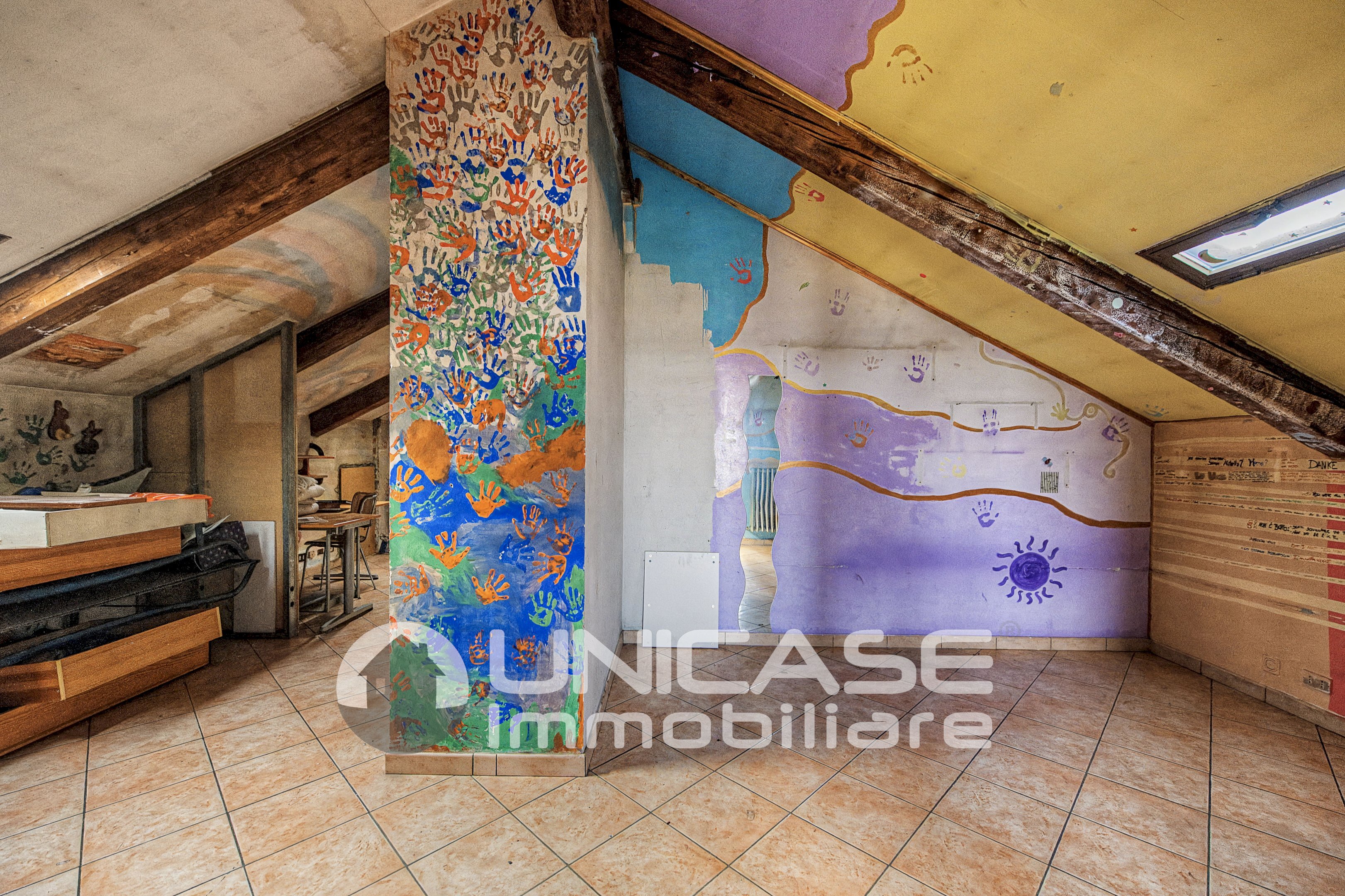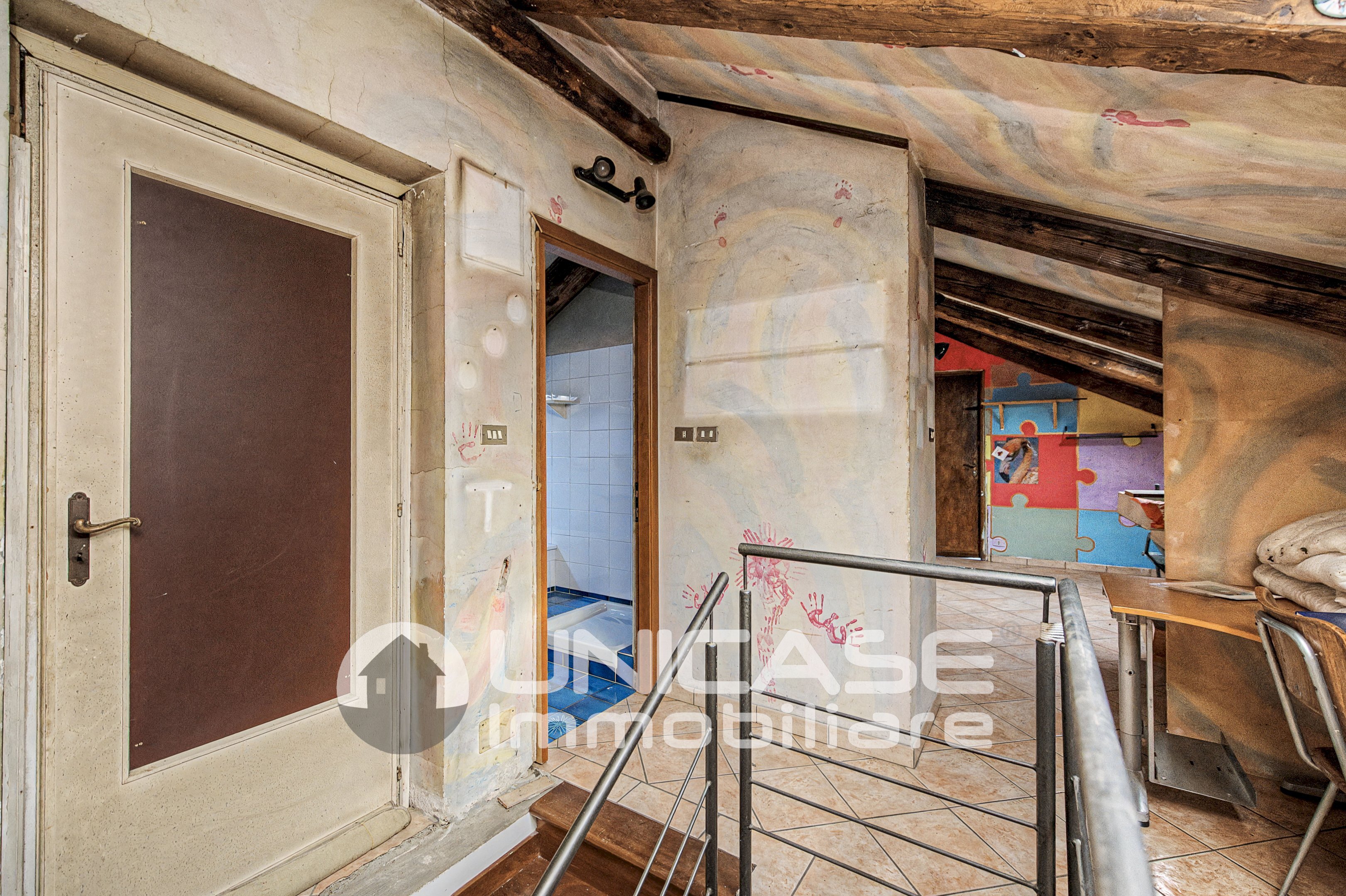 Climbing the stairs leads to the upper floor, where we find the attic, divided into two rooms with an adjoining bathroom and a kitchen corner: a precious and multifunctional space, ideal as a hobby area, study, guest area, or an additional mini apartment for teenage children who want greater independence.